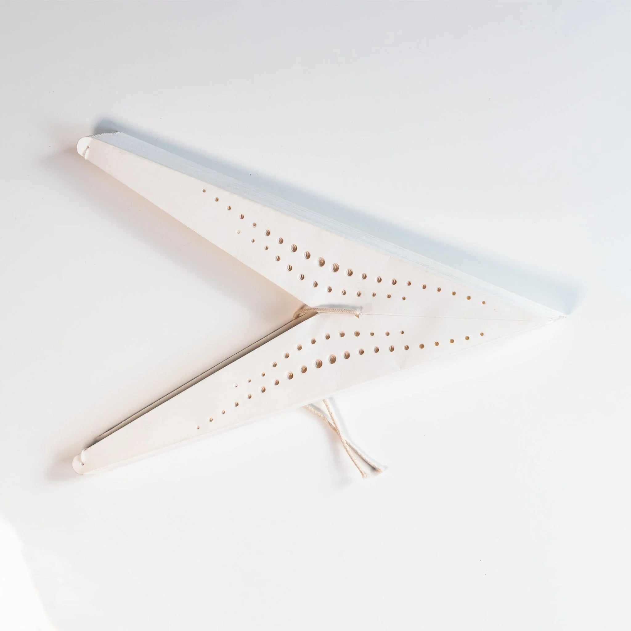 Using the two cords provided, gently bring the two outer points together. If illuminating, place over light source and tie cords firmly to secure in place. Do not pull the cords to open your star.