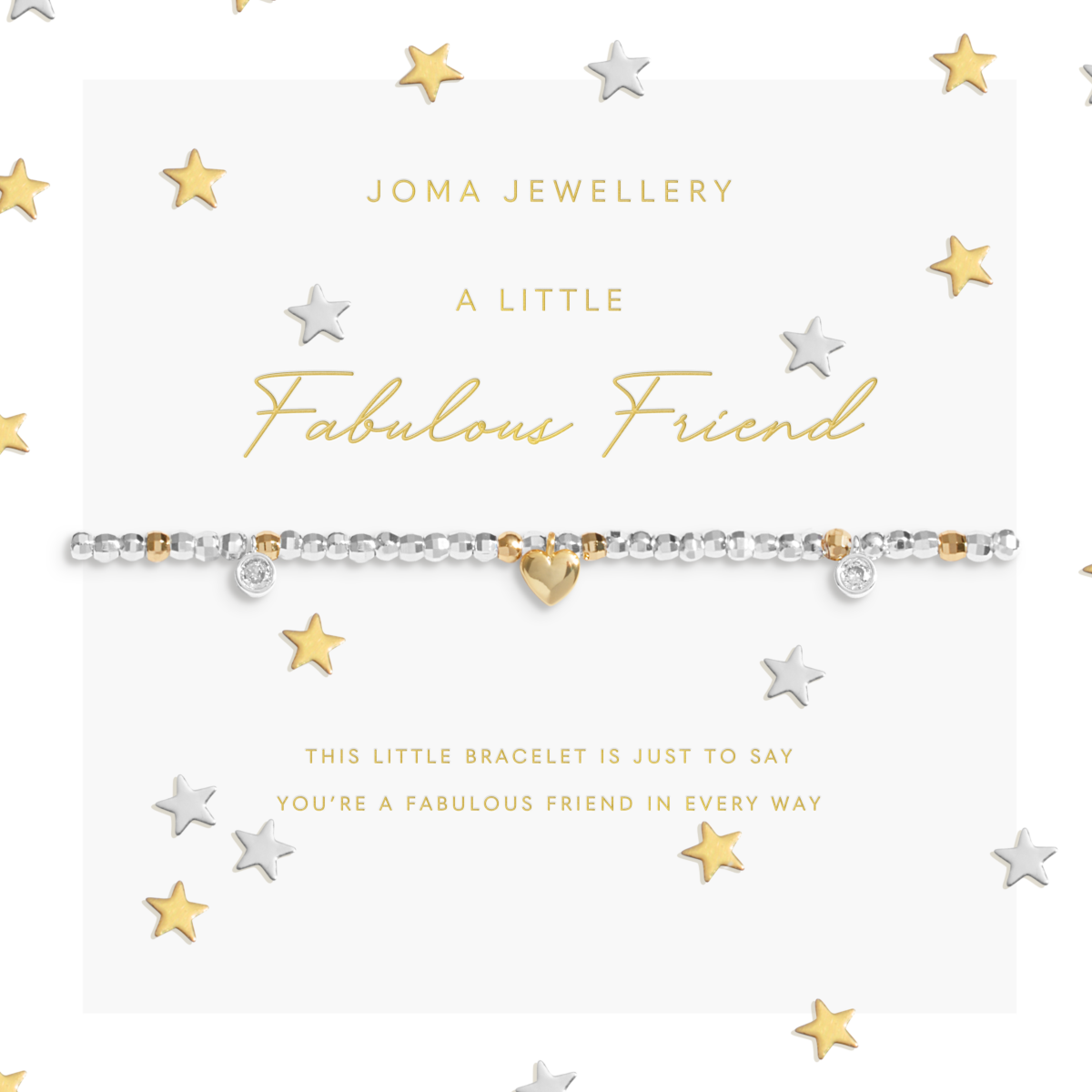 Celebrate all of life's treasured moments with those that mean the most. Joma’s signature metal faceted beaded design ensures a comfortable fit on any wrist and is crowned with a twinkling trio charm design. The Sparkle Confetti A Little 'Fabulous Friend' Bracelet in Silver and Gold Plating is nestled among shimmering silver and gold star-shaped confetti, ready to create a gifting moment they'll treasure for years to come. Cones carefully wrapped around a sentiment-stamped presentation card, ready to spread joy and make the sweetest addition to their stack.